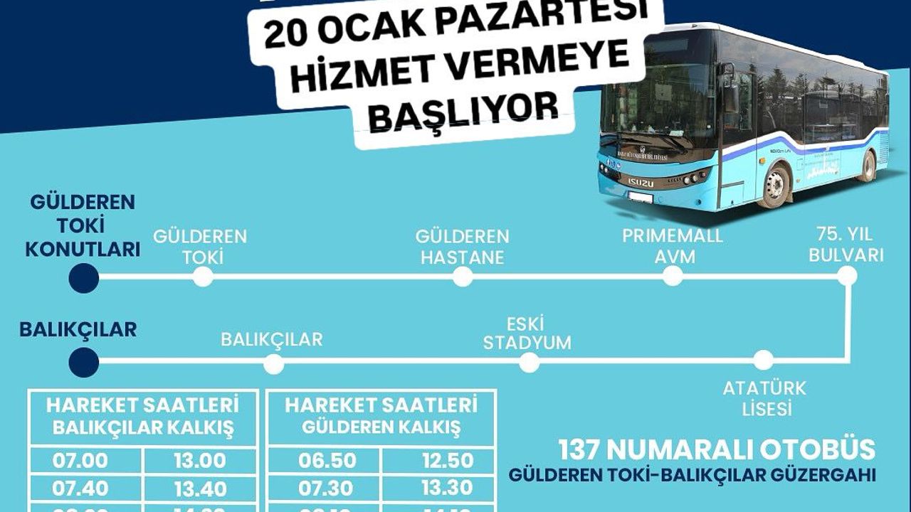 20 Ocak Pazartesi (yarın) hizmete başlayacak hattın Gülderen Mahallesi TOKİ Konutları, Gülderen Hastane, PrimeMall AVM, 75. Yıl Bulvarı, Atatürk Lisesi, Eski Stadyum, Balıkçılar güzergâhlarında hizmet vereceği belirtildi.