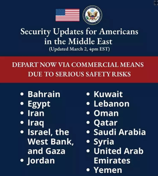 ABD Dışişleri Bakanlığı, Orta doğuda bulunan vatandaşlarına ciddi güvenlik riskleri nedeniyle bulundukları yerleri ticari yollarla hızla tahliye etmeleri uyarısında bulundu.