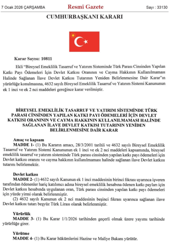 Resmi Gazete'de yayımlanarak yürürlüğe giren Cumhurbaşkanı Kararı'na göre, 4632 sayılı Bireysel Emeklilik Tasarruf ve Yatırım Sistemi Kanunu kapsamında, işveren tarafından ödenen katkılar hariç olmak üzere katılımcıların bireysel emeklilik hesaplarına yatırdıkları tutarlar için devlet katkısı yüzde 20 oranında uygulanacak.