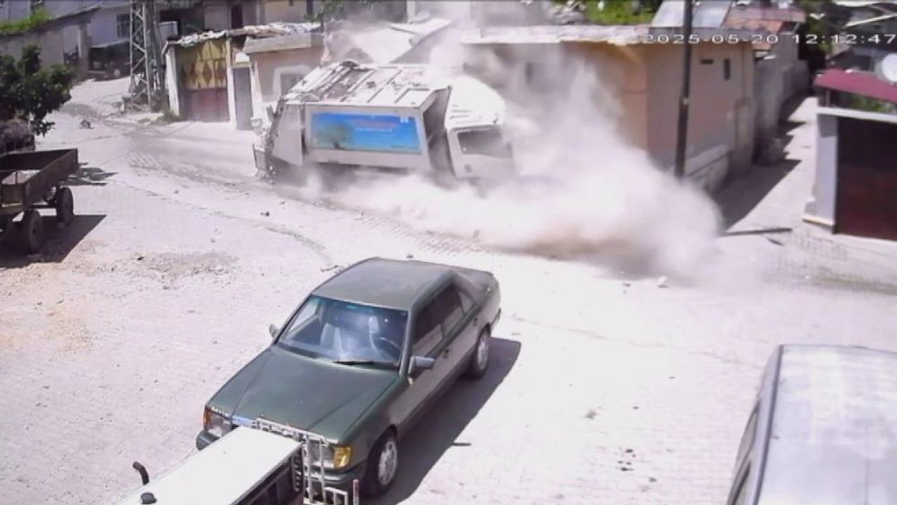 Hatay’da sürücüsünün direksiyon hakimiyetini kaybettiği çöp kamyonunun çarptığı metruk ev yerle bir oldu. Sürücünün yaralandığı kazada evin yıkıldığı anlar güvenlik kamerasına yansıdı.