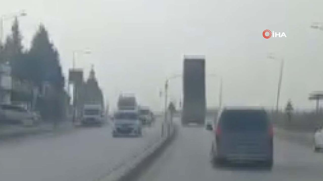 Olay, Antakya ilçesi Narlıca Mahallesi'nde yaşandı. Trafikte damperi açık ilerleyen hafriyat kamyonu, vatandaş tarafından cep telefonuyla görüntülendi. Trafikte bir süre ilerleyen kamyon yürekleri ağza getirirken, trafik lambasına da çarptı.