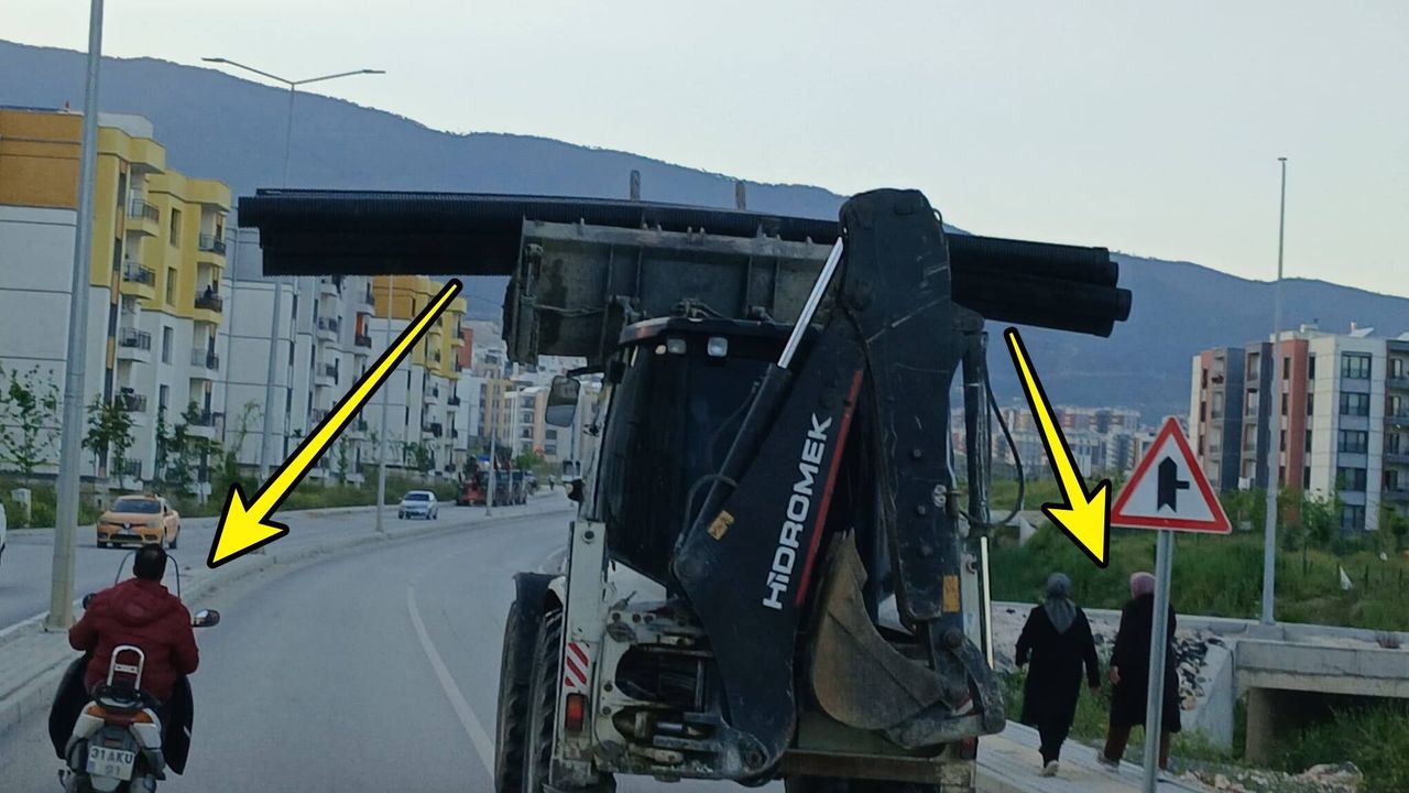 İş makinesinin kepçesine yatay olarak yerleştirilen uzun borular, aracın genişliğini aşarak yolun her iki şeridini de tehdit eder hale geldi. Özellikle arkasından seyreden motosikletliler ve yanından geçmeye çalışan araçlar, boruların her an bir yere çarpma veya savrulma riskiyle burun buruna kaldı.