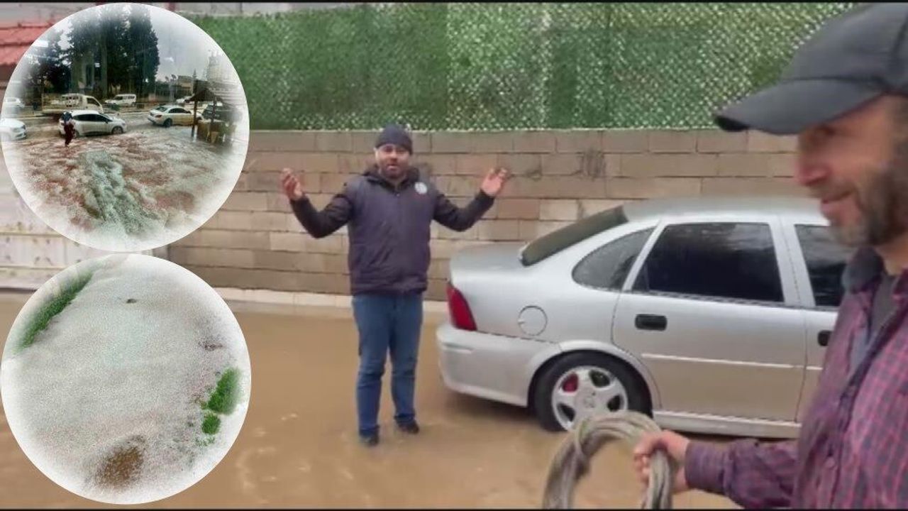 Hatay'ın Reyhanlı ilçesinde etkili olan dolu ve sağanak yağış hayatı olumsuz etkiledi. İlçede sokaklar beyaza bürünürken, aşırı yağış nedeniyle oluşan sel vatandaşlara zor anlar yaşattı.