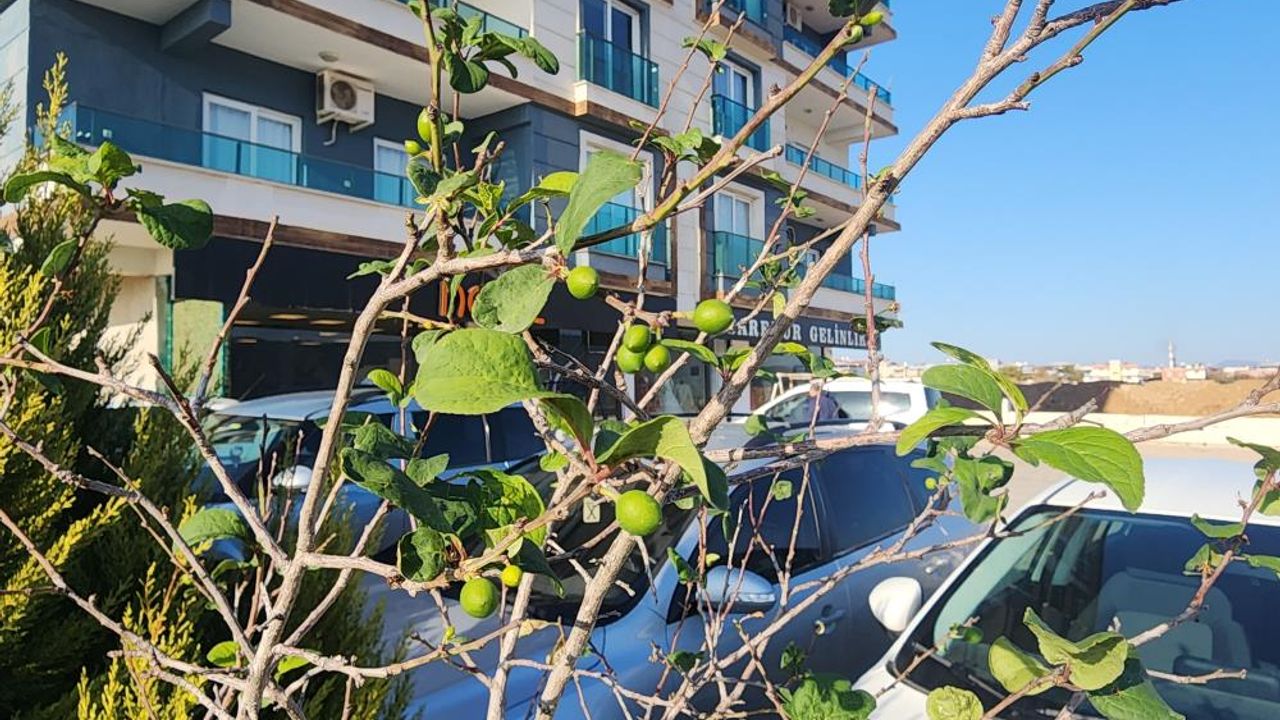 Türkiye’de yaşanan hava değişiminin en çok etkilendiği illerden olan Hatay’da son yılların en kurak dönemi yaşanıyor. Yağışlı havasıyla bilinen kentte yeteri kadar yağış olmazken, adeta mevsimlerde de kayma yaşandı. Mevsimlerin değişmesiyle birlikte Hassa ilçesinin Ardıçlı Mahallesi’nde bir binanın otoparkında bulunan erik ağacı meyve verdi.