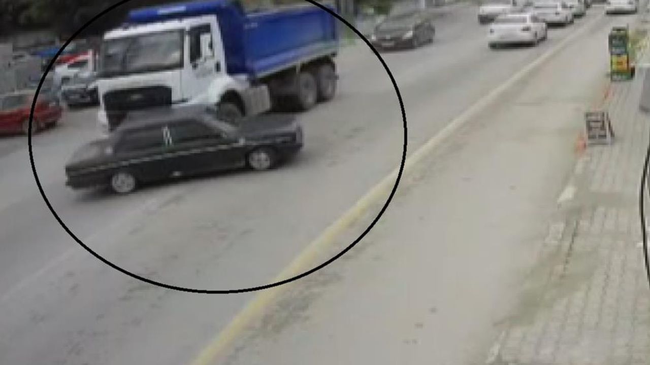 Kaza, Dörtyol ilçesi Musa Kazım Arıkan Bulvarı üzerinde yaşandı. Aynı istikamette ilerleyen hafriyat kamyonu, kör noktasına gelen Tofaş Fiat marka otomobili önüne alarak sürüklemeye başladı. Yaralananın olmadığı kazada oyuncak araba gibi kamyonun önünde sürüklenen araç, park halindeki motosiklete çarparak durabildi. Kaza anıysa çevrede bulunan iş yerinin güvenlik kamerasına yansıdı. Görüntülerde; otomobilin bir anda kamyonun önünde kalarak sürüklendiği görüldü.