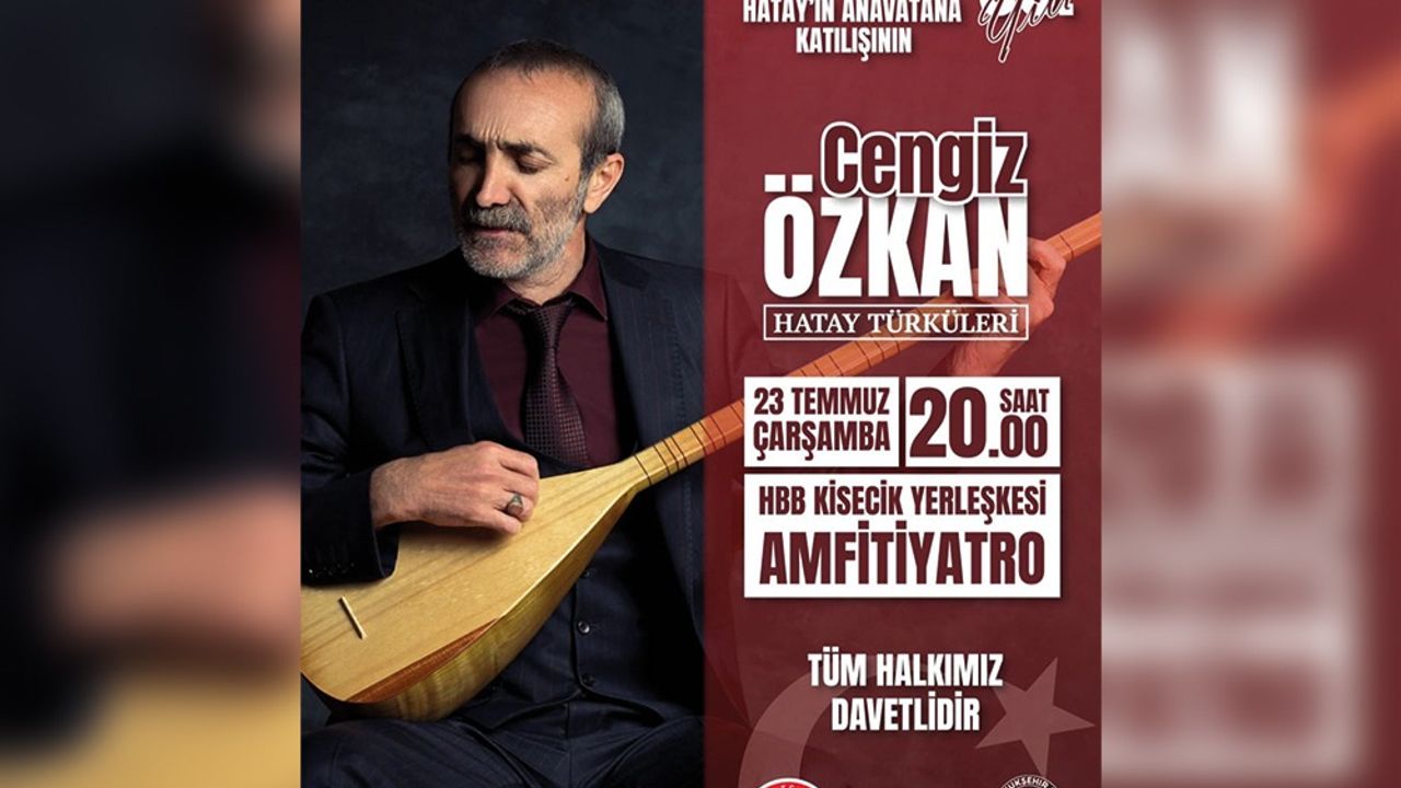 Hatay Büyükşehir Belediyesi (HBB) Hatay’ın Ana Vatana Katılışı’nın 86. yıl dönümü nedeniyle Hatay Valiliği ve HBB tarafından düzenlenecek etkinlikler kapsamında ücretsiz konserde ünlü müzisyen ve bağlama sanatçısı Cengiz Özkan, birbirinden güzel türkülerle Hataylı müzikseverlerle buluşacak.