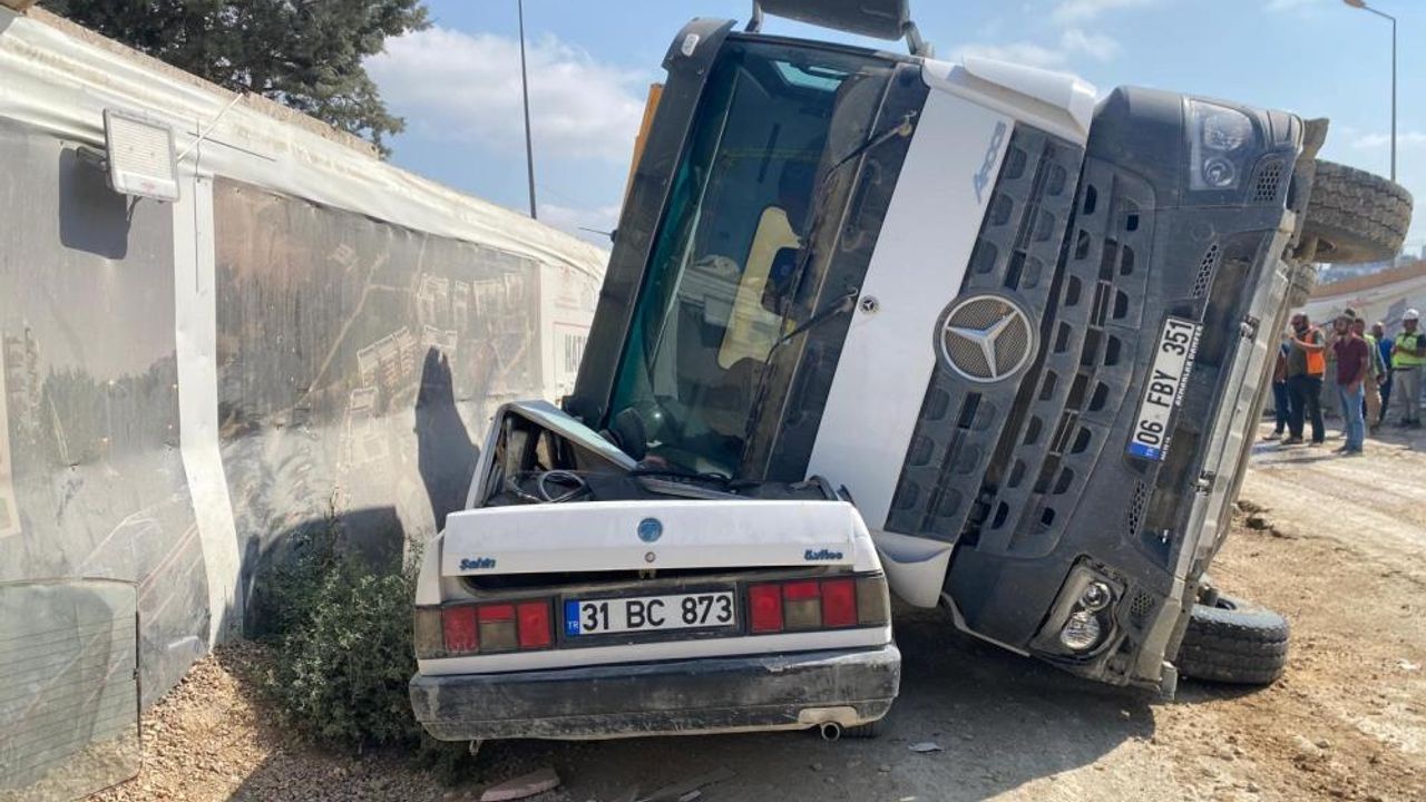 Hatay’da şantiyede içerisinde sürücüsünün kontrolü kaybettiği toprak yüklü hafriyat kamyonu, park halindeki Tofaş aracın üzerine devrildi. Kaza esnasında otomobilde kimsenin olmaması faciayı önledi.