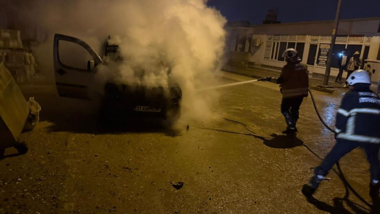 Hatay'ın Kırıkhan ilçesinde park halindeyken yanmaya başlayan hafif ticari araçta hasar oluştu.