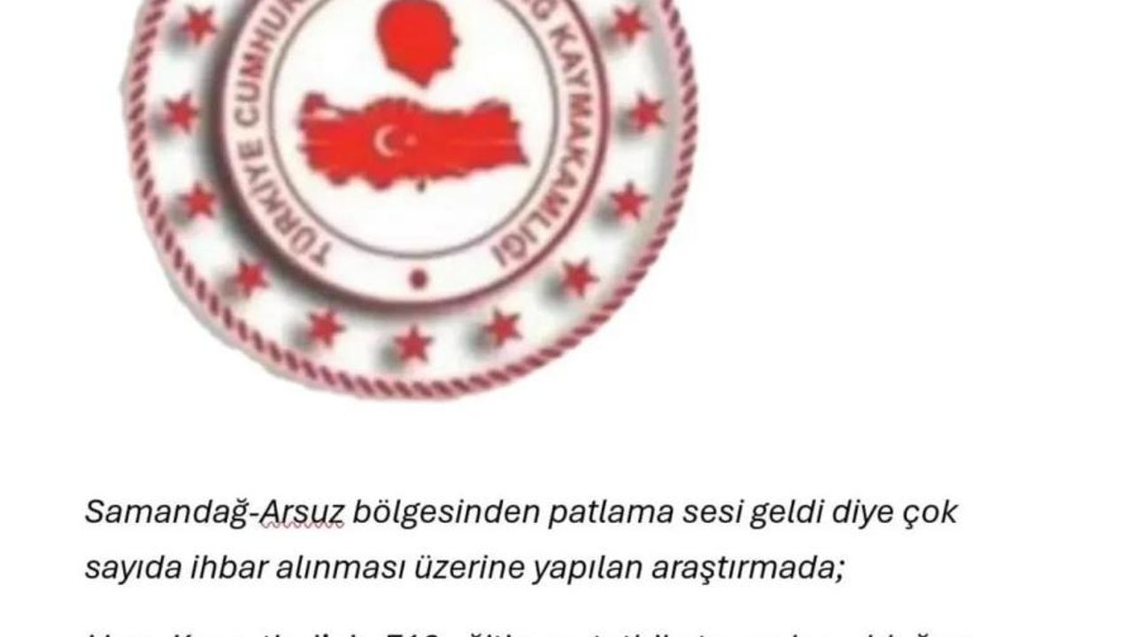 Samandağ Kaymakamlığından yapılan açıklamada, "Samandağ - Arsuz bölgesinden patlama sesi geldi diye çok sayıda ihbar alınması üzerine yapılan araştırmada; Havva Kuvvetleri’nin F-16 eğitim ve tatbikat uçuşları olduğu ve meydana gelen yüksek sesin sonik patlamadan kaynaklandığı tespit edildi. Vatandaşlarımızın asılsız haberlere inanmamaları önemle rica olunur" ifadeleri kullanıldı.