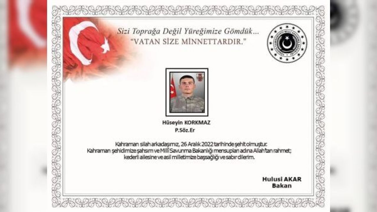 Gaziantep Valiliği Twitter hesabından yaptığı açıklamada “Pençe-Kilit Harekâtı operasyon bölgesinde şehit düşen kahraman Mehmetçiğimiz, hemşehrimiz P. Söz. Er Hüseyin Korkmaz’a Allah’tan rahmet, ailesi ve sevenlerine sabr-ı cemil diliyoruz. Milletimizin başı sağ olsun” ifadelerini kullandı.