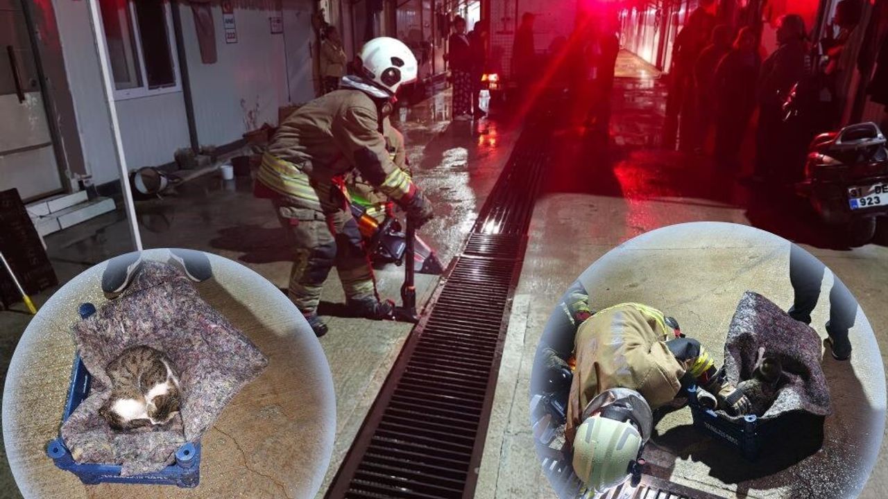 Hatay'da su gideri içerisine yavrulayan kedi ve 3 yavrusu itfaiye ekipleri tarafından mazgalın açılmasıyla kurtarıldı.