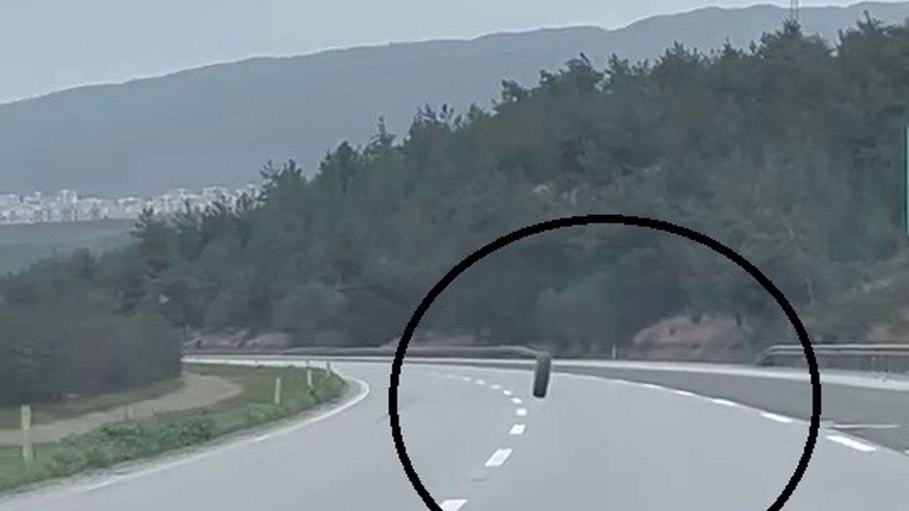 Hatay'da otobanda seyir halindeki tırdan fırlayan lastiğin başıboş halde ilerlediği anlar cep telefonu kamerasına yansıdı.