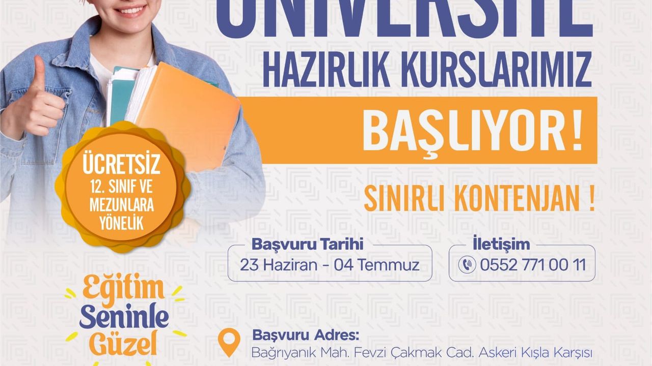 Antakya Belediyesi’nden yapılan açıklamada; 12. Sınıf öğrencileri ve mezunlara özel hazırlanan ücretsiz kursların başvurularının başladığı ve kontenjanların sınırlı olduğu belirtildi. 23 Haziran – 4 Temmuz tarihleri arasında gerçekleştirilecek kurslarla ilgili bilgi almak isteyenlerin 0552 771 00 11 Numaralı telefonu arayabilecekleri ifade edildi.